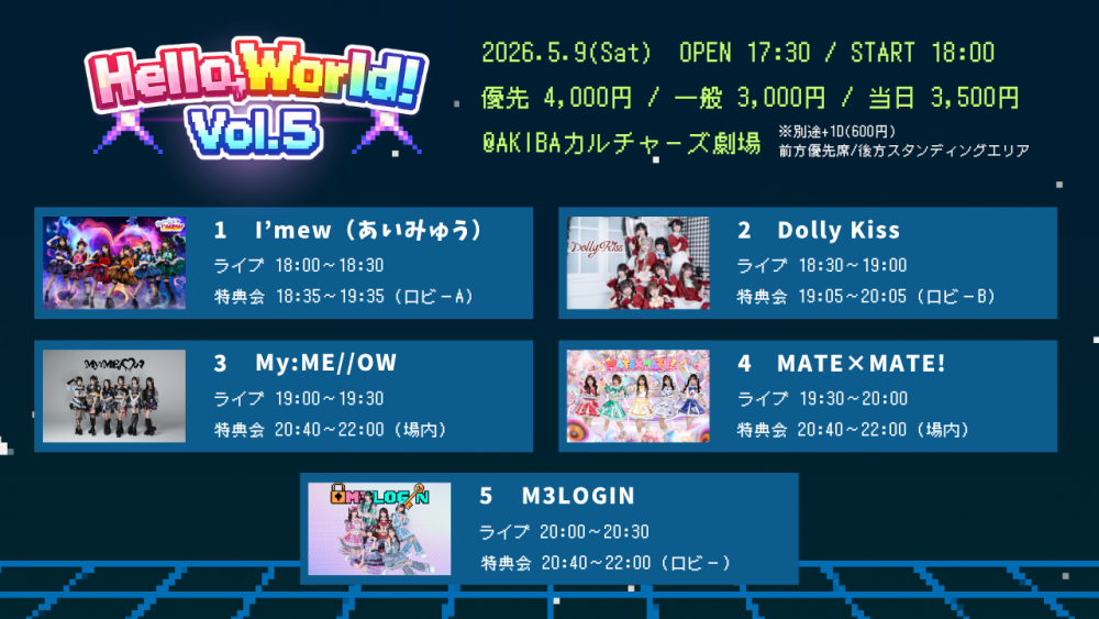 04月 26日 Shibu3 project 定期公演 Vol.5 出演 Shibu3 project 開場 12:00〜 開演 12:30〜 04月 26日 TOSAKAガチ恋フェス!! Vol.2 出演 HEROINE CIRCUS 仮面女子 ツボミシンフォニー wonder channel Addiction Me れんてつ idoress にゃんすきっ♡? YUMEADO CiTRON 開場 16:30〜 開演 17:00〜 04月 27日 愛乙女★DOLL単独公演/AKIBAカルチャーズ劇場 出演 愛乙女★DOLL 開場 18:30〜 開演 19:00〜 04月 28日 BOCCHI。定期公演『盛り上がりが足りないYO!!』vol.41 出演 BOCCHI。 開場 18:30〜 開演 19:00〜 05月 09日 It's been ages! 出演 鹿沼亜美 田辺奈菜美 和泉芳怜 武内愛莉 開場 12:30〜 開演 13:00〜